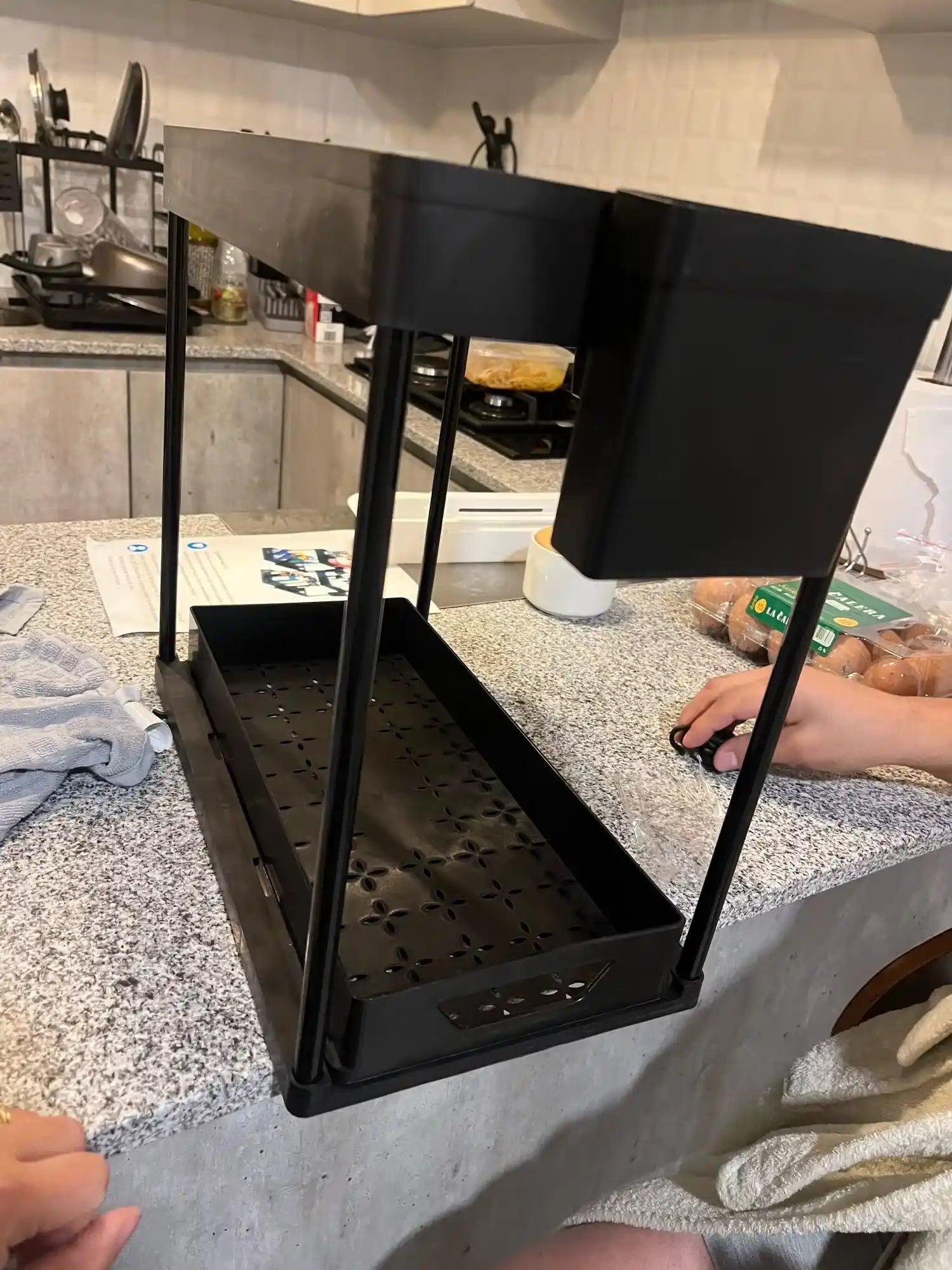 "I luv this organizer! It's exactly what I needed to declutter my kitchen and bathroom. Assembly was super easy too. Now I have more space and it looks neat. Highly recommend this if u want to tidy up fast!"
